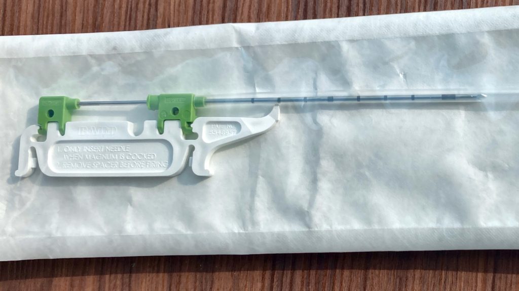 Usa una aguja hueca para obtener “pellizcos” o muestras cilíndricas del tejido tumoral los cuales serán enviados al laboratorio de patología. Puede usarse ultrasonido o tomografía para guiar la aguja al sitio exacto de la lesión.